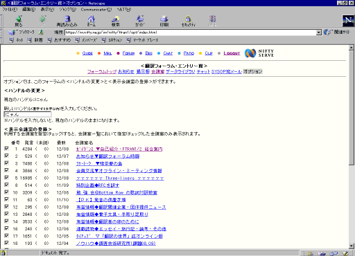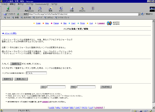 なお、フォーラムに入会する前に、すべてのフォーラムに共通するあなたのハンドルを設定しておくこともできます。パソコン通信の場合は、「GO HANDLE」で設定してください。WWWブラウザでアクセスなさっている場合は、「GO」のボックスに「HANDLE」と入力して GO ボタンを押すと、次のような画面になります。
